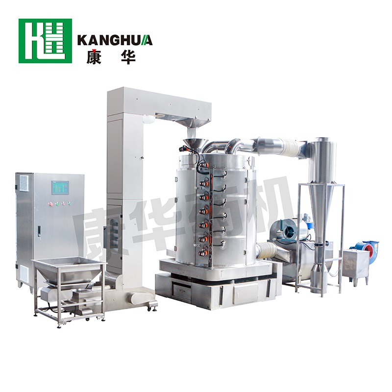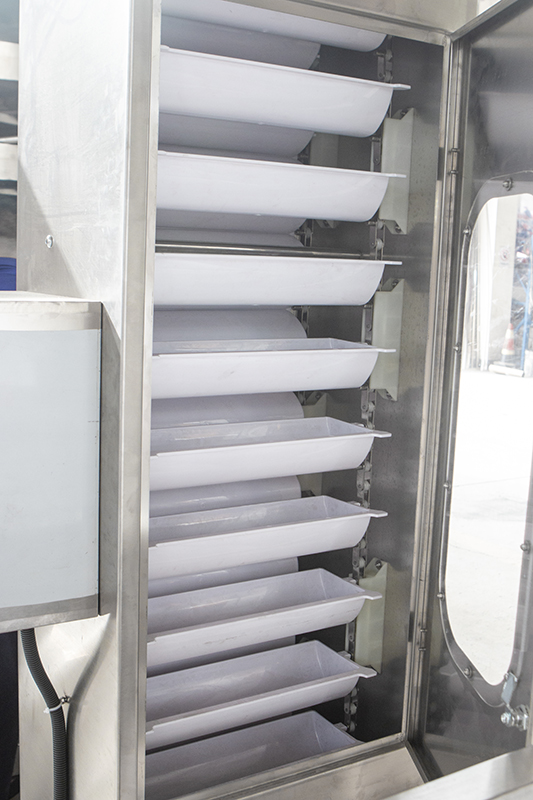 This machine is composed of an oven, a vibrating base, an automatic feeding mechanism, a dehumidification device, a cooling device, connecting air ducts, a steam heat exchanger, a fan, etc. When the steam enters the heat exchanger for heat exchange, high-temperature dry hot air is generated and enters the oven from bottom to top under the action of a powerful fan. Meanwhile, the material enters the oven from the top under the operation of the automatic suction mechanism. The hot air and the material exchange in countercurrent within the oven. Under the action of the vibrating motor, the material rolls and moves along the Archimedean spiral and fully contacts with the hot air. Thus achieving a drying effect. The upper part of the oven is connected to a moisture absorption device to promptly remove the moisture generated during baking. The oven is equipped with mesh plates to meet the drying requirements of materials of different sizes. The most prominent feature of the fully automatic vibrating drying equipment is that it can fully utilize energy, has good continuous operation, uniform drying of materials, large production capacity, convenient operation, good hygiene conditions, easy cleaning, easy maintenance and wide application range. The whole machine is made of all stainless steel and meets GMP requirements. This machine is suitable for drying materials with moist water, but not for drying materials containing bound water.